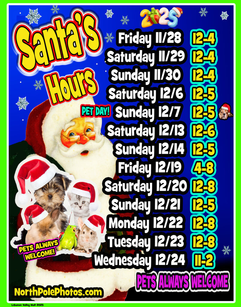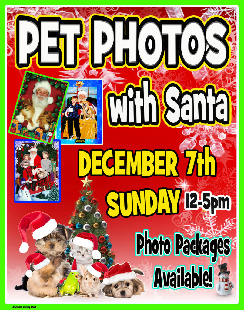 Bring the kids out to visit with Santa at the Lebanon Valley Mall beginning Friday, November 28th at noon. Pets are welcome too!